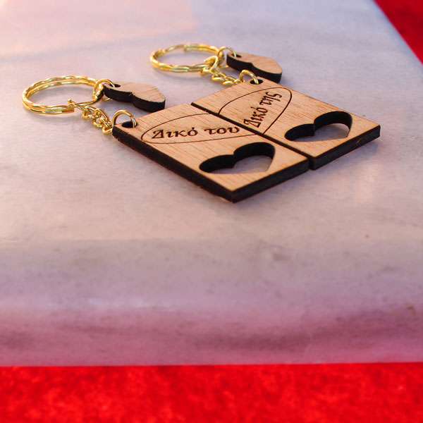 Είναι κατασκευασμένο από ξύλο με αποσπώμενη καρδιά και χρυσαφί κρίκο – μπρελόκ. 2 μπρελόκ ενα για εσάς και ενα για τον αγαπημένο/νη σας. Η κατασκευή του είναι πρωτότυπη, το μπρελόκ ενώνεται και περνά ένα μήνυμα ότι τα άτομα που το διαθέτουν είναι ενωμένα.