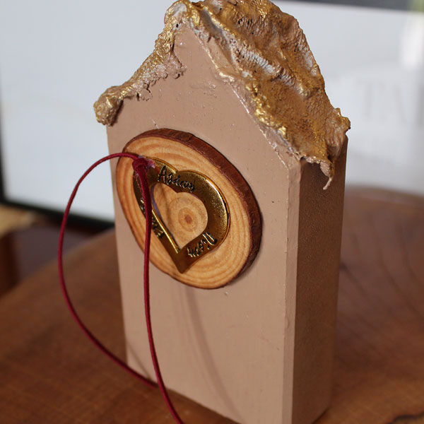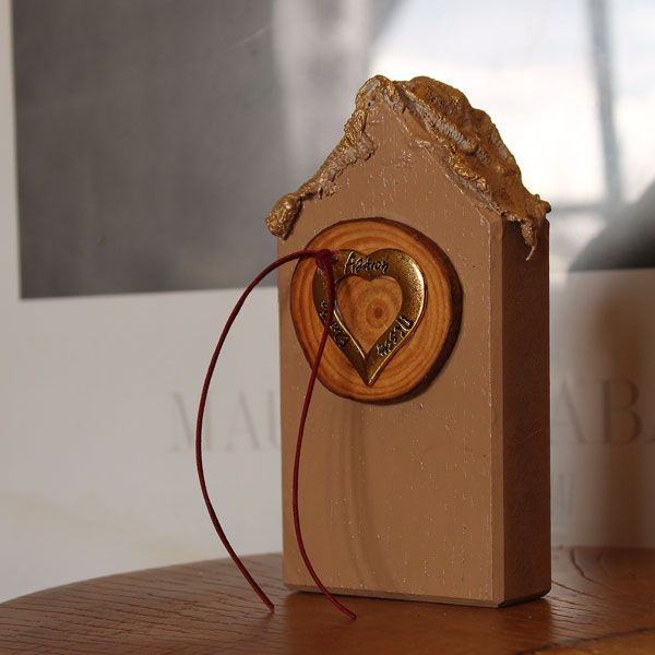 Υλικά: Ξύλινο σπίτι σε μπεζ απόχρωση. Διακοσμήθηκε με φέτα ξύλου, μεταλλική, χρυσή καρδιά με ευχές και σουέτ μπορντώ κορδόνι. Έχει μια ιδαίτερη τεχνοτροπία με κοκαλωμένη γάζα και χρυσή πατίνα.