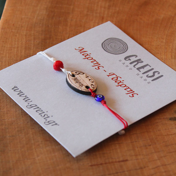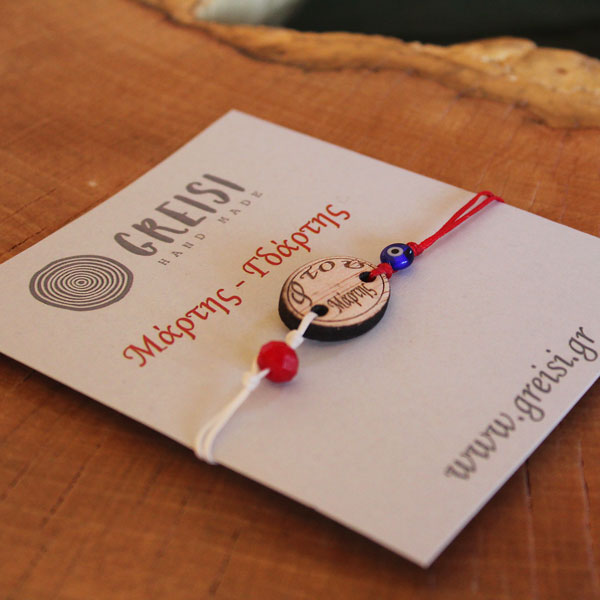 Είναι κατασκευασμένα από κόκκινο και λευκό κειρωμένο σκοινί. Έχει ξύλινο στοιχείο – Φτου Μάρτης, γυάλινη χάντρα και μάτι Μουράνο. Αυξομείωση μακραμέ στο κορδόνι για να προσαρμόζεται σε όλους τους καρπούς.