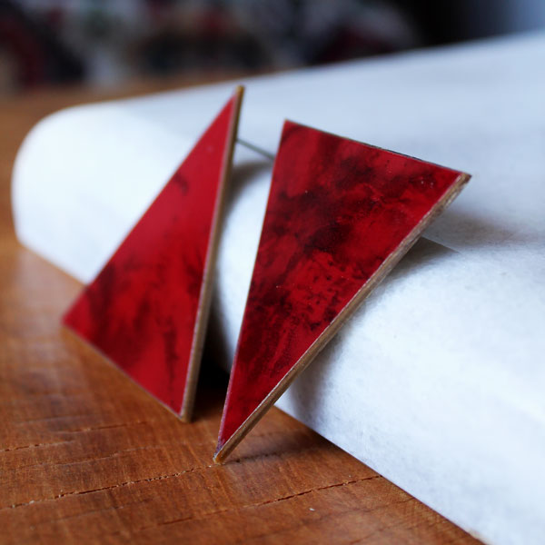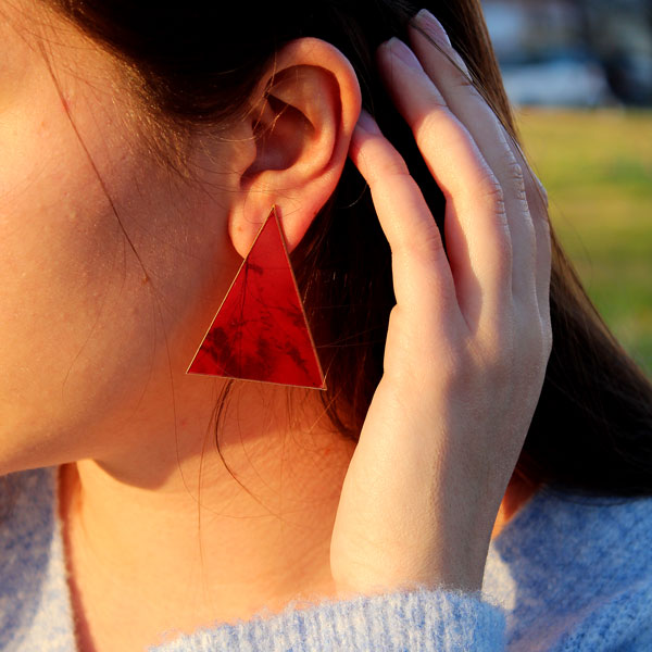 Γεωμετρικά σκουλαρίκια από plexiglass. Έχει μπορντό χρώμα με όψη γρανίτη και δύο σετάκια κουμπώματα για να επιλέξετε αυτό που σας βολεύει.