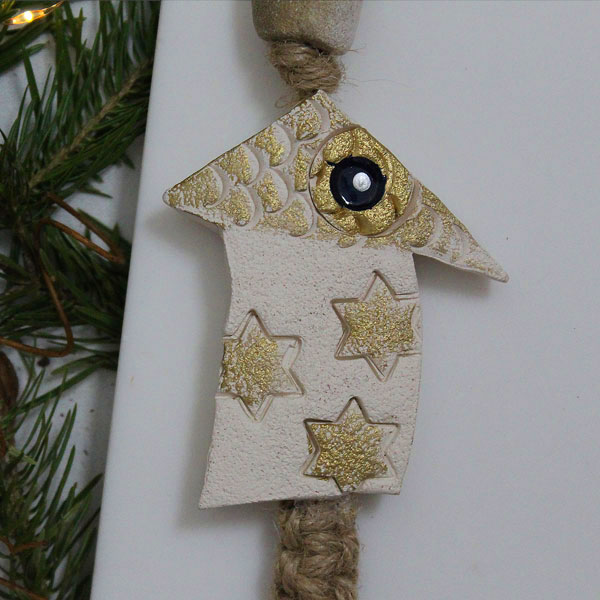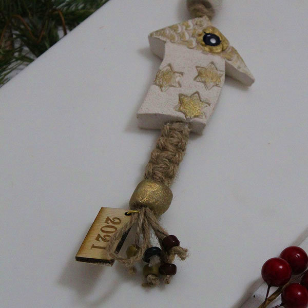 Είναι κατασκευασμένο από φυσικό σκοινί με μακραμέ πλέξη. Το σπιτάκι είναι χειροποίητο κεραμικό με φύλλο χρυσού και σμαλτένιο μάτι. Πύλινες και γυάλινες χάντρες. Ξύλινο αποσπώμενο 2021.