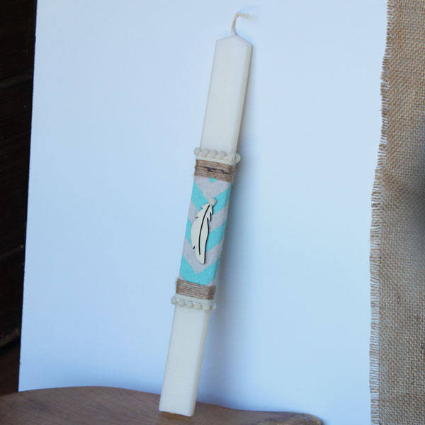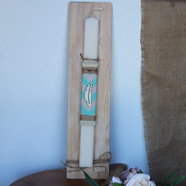 Η εφηβική λαμπάδα είναι ελληνικής κατασκευής, ελαφρώς αρωματισμένη. Διακοσμήθηκε με λινό ύφασμα, πομ πομ, φυσικά κορδόνια και ξύλινα στοιχεία. Τοποθετημένη σε ξύλινο ταμπλαδάκι ανάλογα διακοσμημένο 39 επί 9,5. Όλες οι λαμπάδες συνοδεύονται από όμορφη συσκευασία δώρου.
