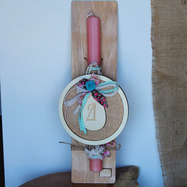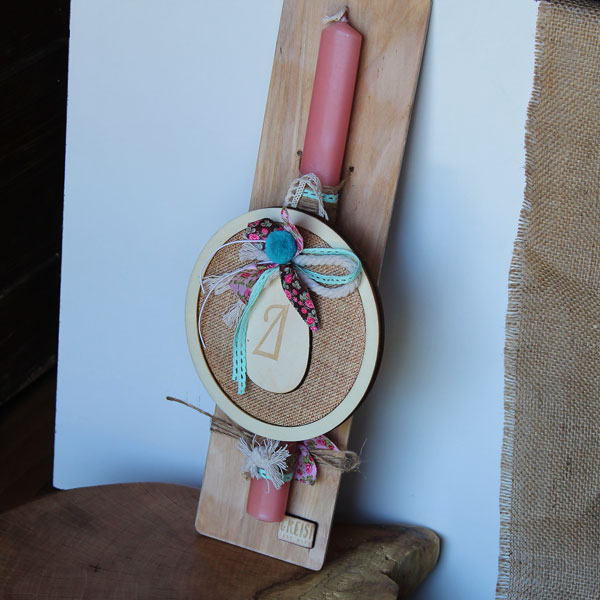 Η λαμπάδα με το μονόγραμμα, είναι ελληνικής κατασκευής. Είναι αρωματισμένη. Το στοιχείο είναι χειροποίητο και αποσπώμενο που μπορεί να στολίσει την πόρτα του παιδικού δωματίου ή να αποτελέσει μέρος της διακόσμησης αυτού. Κορδέλες και κορδόνια εξαιρετικής ποιότητας. Είναι τοποθετημένη σε ξύλινο ταμπλαδάκι ανάλογα διακοσμημένο 39 επί 9,5. Όλες οι λαμπάδες συνοδεύονται από όμορφη συσκευασία δώρου.