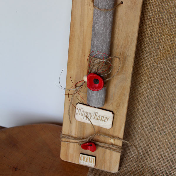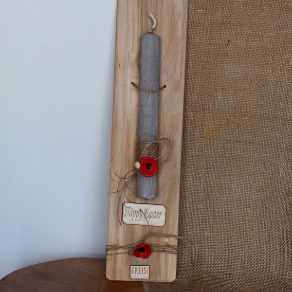 Η λαμπάδα είναι ελληνικής κατασκευής, γκρι, ξυστή αρωματισμένη. Παπαρούνα χειροποίητη, ατσαλόσιρμα και φυσικό κορδόνι αποτελούν τον στολισμό αυτής της λαμπάδας. Είναι τοποθετημένη σε ξύλινο ταμπλαδάκι ανάλογα διακοσμημένο 39 επί 9,5εκ. Όλες οι λαμπάδες συνοδεύονται από όμορφη συσκευασία δώρου.