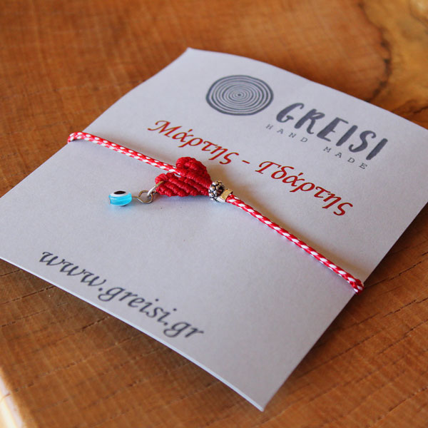 Μάρτης κατασκευασμένος από πολυεστερικό κορδόνι. Έχει μακραμέ χειροποίητη καρδιά με χρυσαφί μεταλλικές λεπτομέρειες και μάτι ακρυλικό. Αυξομείωση μακραμέ για να προσαρμόζεται σε όλους τους καρπούς.