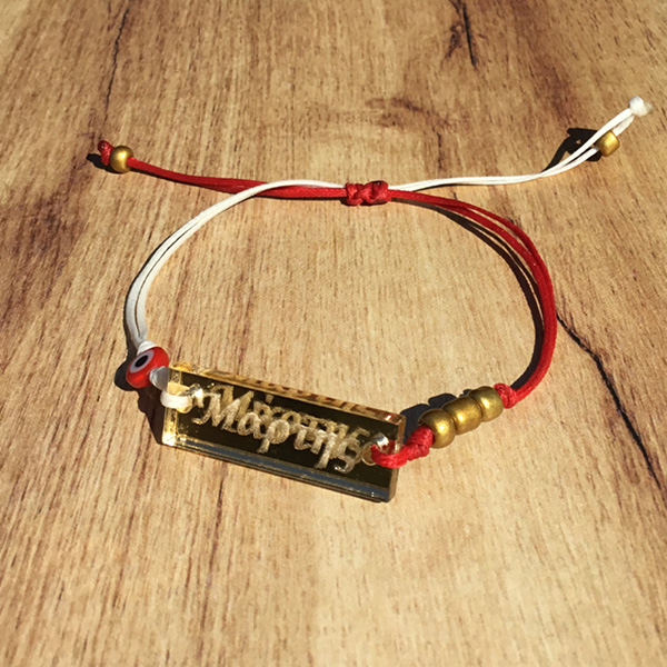 Το βραχιόλι είναι φτιαγμένο, από κόκκινη και λευκή κερωμένη κλωστή, δεμένες σε plexiglass gold mirror στοιχείο “Μάρτης”. Το μέγεθος αυξομειώνεται.