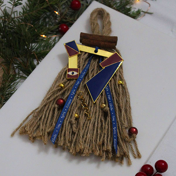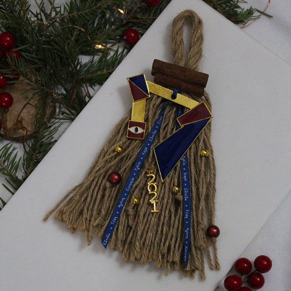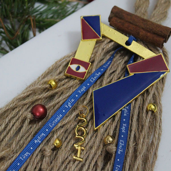 Είναι κατασκευασμένο από φυσικό σκοινί με πολύ ιδιαίτερο μεταλλικό μάτι, και ακρυλικές χάντρες. Γκρο κορδέλα με ευχές. Ξύλο κανέλας και αποσπώμενο 2021.