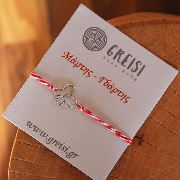 Μάρτης κατασκευασμένος από βαμβακερό στριφτό σκοινί, λευκό και κόκκινο. Ασημί μεταλλική πεταλούδα. Η πεταλούδα Μάρτης δένει από κάτω για να υπάρχει η δυνατότητα να χωράει σε όλους τους καρπούς.
