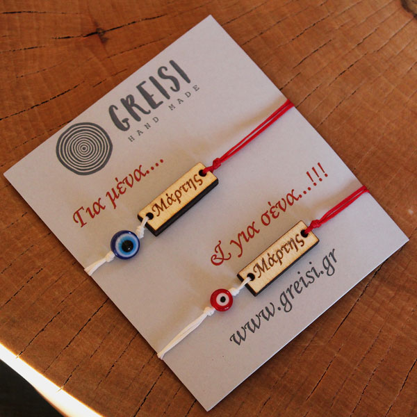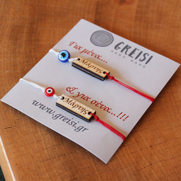 Set Μάρτη για ζευγάρι κατασκευασμένα από κόκκινο και λευκό κειρωμένο σκοινί. Έχει ξύλινα στοιχεία και μάτι Μουράνο. Αυξομείωση μακραμέ στο κορδόνι για να προσαρμόζεται σε όλους τους καρπούς.