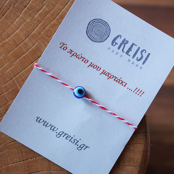 Το μαρτάκι είναι κατασκευασμένο από βαμβακερό στριφτό σκοινί, λευκό και κόκκινο. Έχει ακρυλικό μάτι και δένει από κάτω για να υπάρχει η δυνατότητα να χωράει σε όλους τους καρπούς.