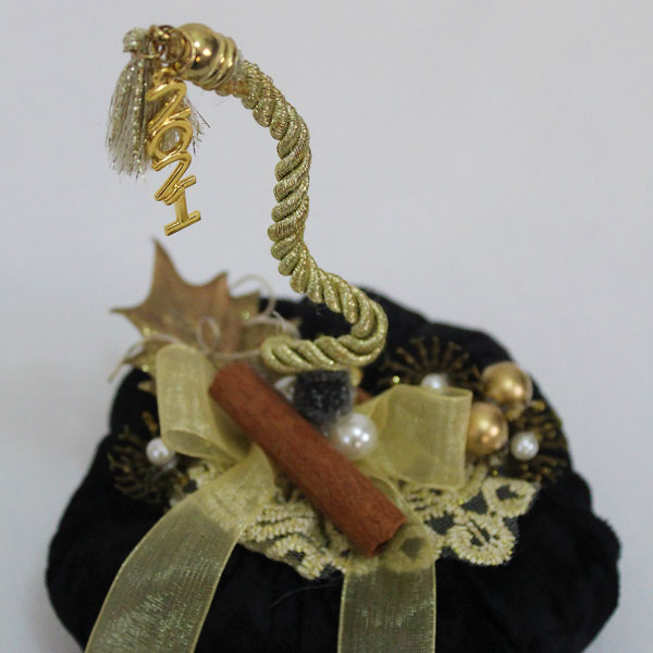 Είναι κατασκευασμένη από μαύρο, βελούδινο ύφασμα. Διακοσμήθηκε με ακρυλικές πέρλες, κορδέλα οργάτζα και μεταλλιζέ κορδόνι. Φουντάκι, δαντέλα και ξύλο κανέλας. Αποσπώμενο 2021.