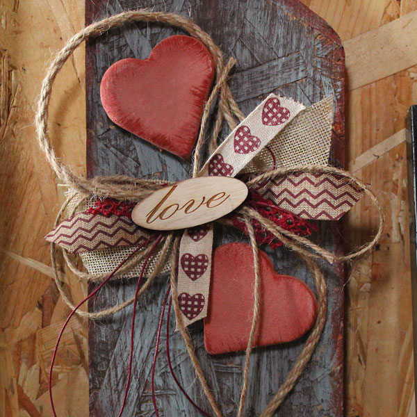 Διακοσμήθηκε με πύλινες χειροποίητες καρδιές και λουλούδι. Ξύλινο ¨love¨, κορδέλες και φυσικό σκοινί.