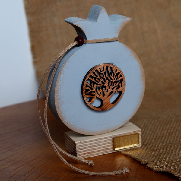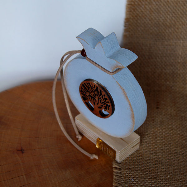 Ξύλινο ρόδι σε γκρι απόχρωση. Είναι κατασκευασμένο από ξύλο. Έχει ξύλινο στοιχείο με το δέντρο της ζωής, και σουέτ κορδόνι.