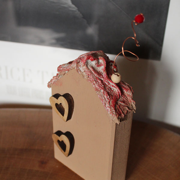 Διακοσμήθηκε με ξύλινες καρδιές, σίρμα και χάντρες. Έχει μια ιδαίτερη τεχνοτροπία με κοκαλωμένη γάζα και κόκκινη πατίνα.